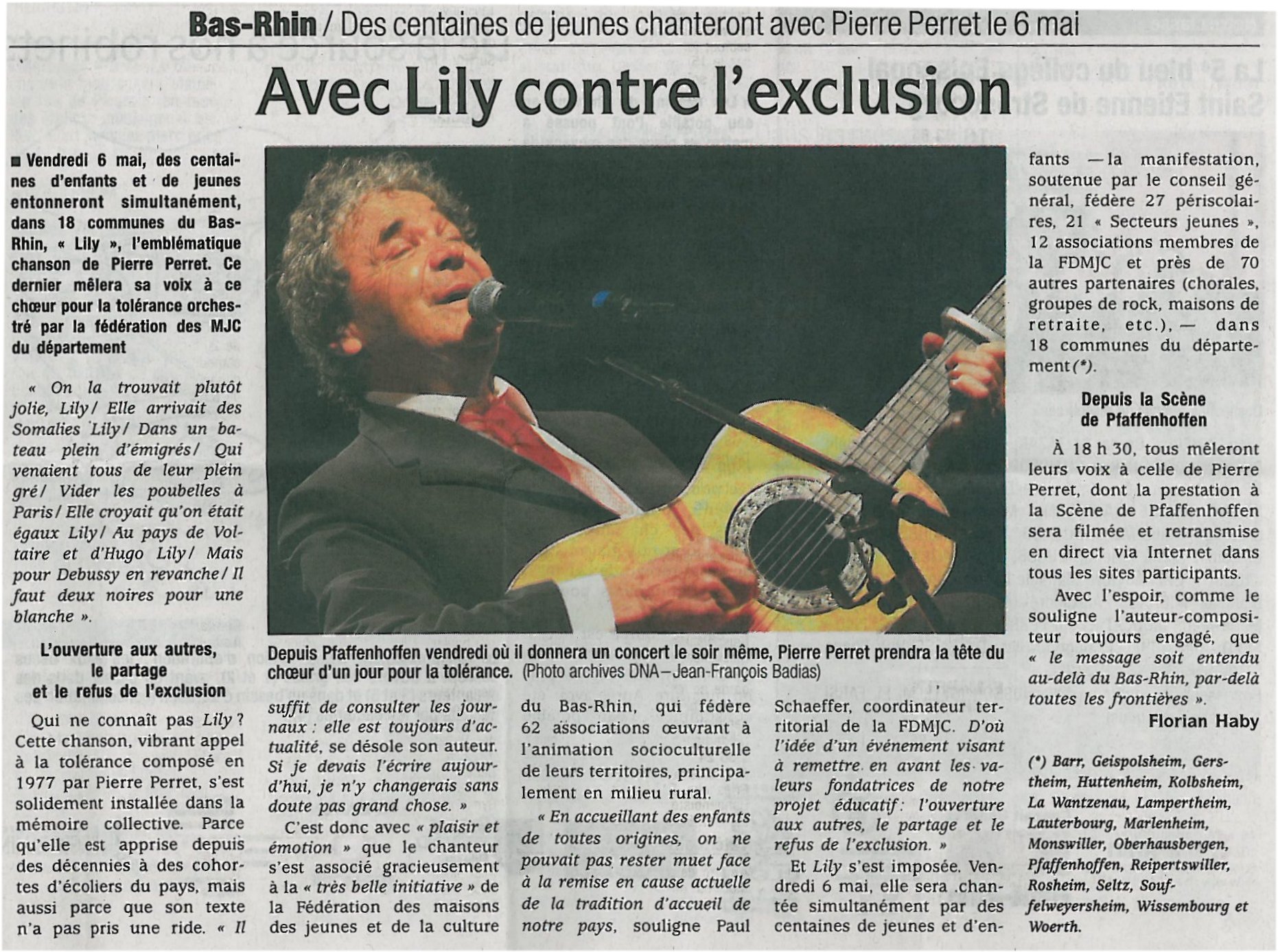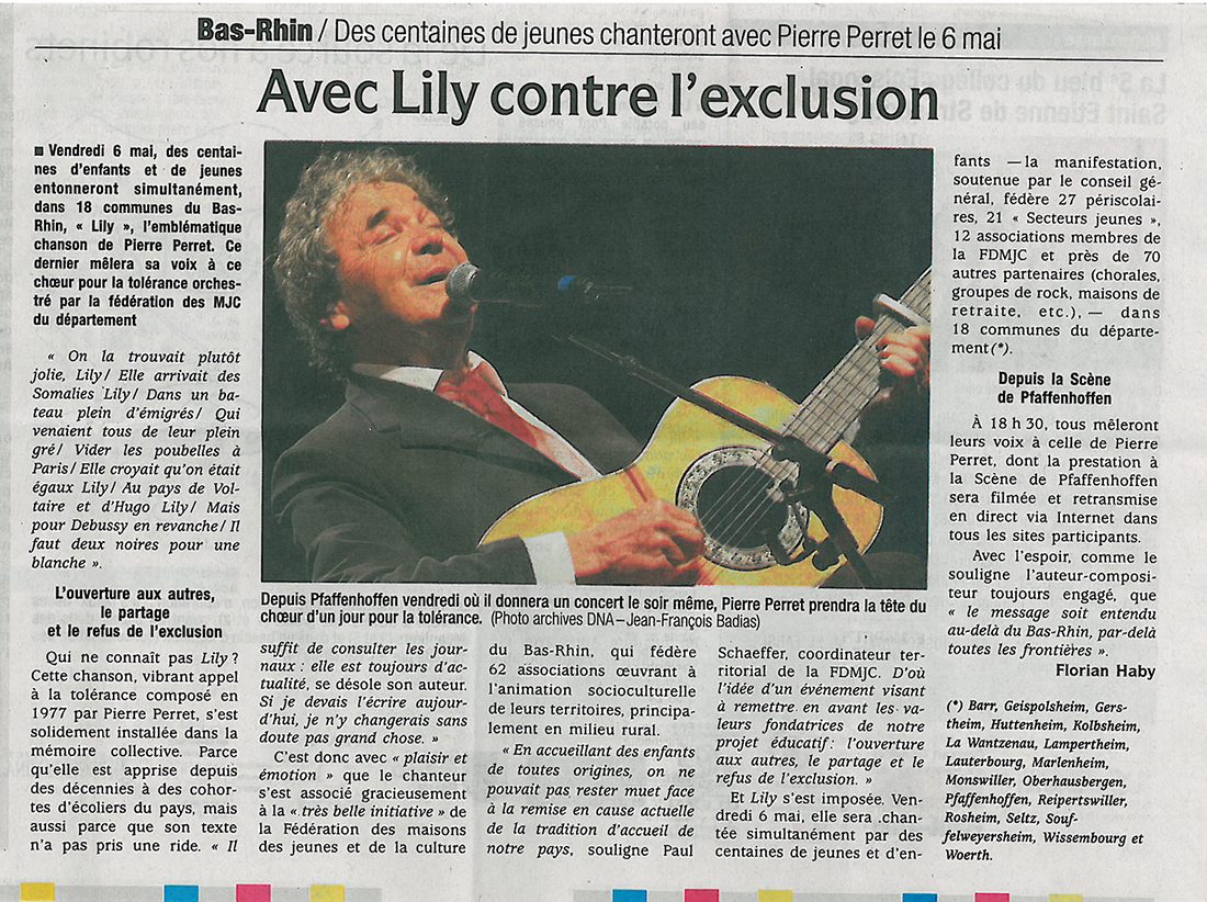 Le point commun entre tous les acteurs de cet événement : chanter simultanément en duplex avec Pierre Perret, parrain de la manifestation et présent à « La Scène » de Pfaffenhoffen, la célèbre chanson « Lily » (d’où le nom de la fête !), à 18h30 le vendredi 6 mai 2011.